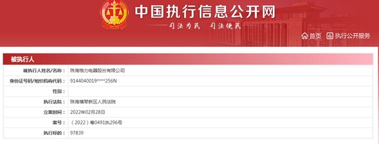 从中国执行信息公开网获悉,近日,珠海格力电器股份有限公司(以下简称“格力电器”)新增一则被执行人信息,执行标的97839元,执行法院为珠海横琴新区人民法院。