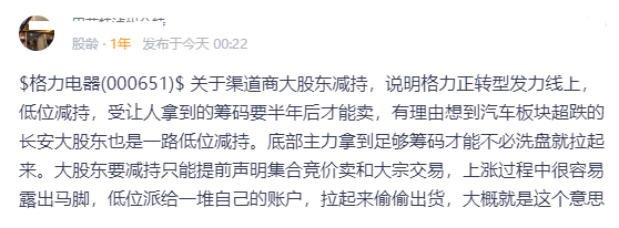 不过,“一千位观众眼中就有一千位哈姆雷特”。有股民认为大股东减持是利空,那自然就有股民认为低位减持是利好了。在网上,有股民表示:“关于渠道商大股东减持,说明格力正转型发力线上,低位减持,受让人拿到的筹码要半年后才能卖,有理由想到汽车板块超跌的长安汽车的大股东也是一路低位减持。底部主力拿到足够筹码才能不必洗盘就拉起来……”