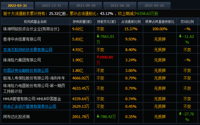 2021年三季度末,格力电器前十大流通股东累计持有股数为27.45亿股,较上期减少3.10亿股;2021年四季度末,这一数值变为25.95亿股,较上期减少1.50亿股;2022年一季度末,这一数值变为25.32亿股,又较上期减少了6358.63万股。