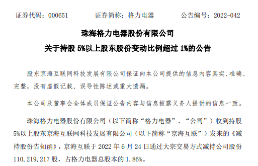 格力电器披露的股东股份变动公告中显示,京海互联通过大宗交易方式减持公司股份1.1亿股,占格力电器总股本的1.86%。