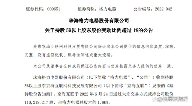 昨天晚上格力电器发布公告称,珠海格力电器股份有限公司(以下简称“格力电器”、“公司”)收到持股5%以上股东京海互联网科技发展有限公司(以下简称“京海互联”)发来的《减持股份告知函》,京海互联于2022年6月24日通过大宗交易方式减持公司股份110,219,217股,占格力电器总股本的1.86%。