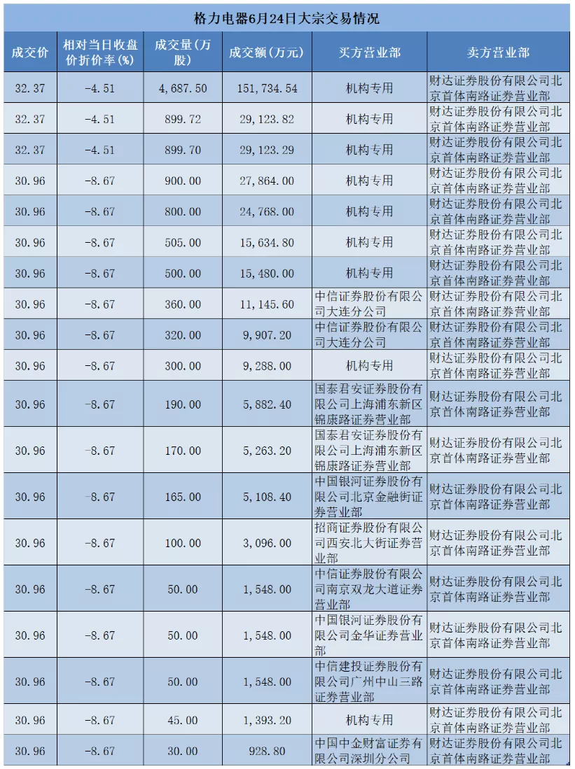 6月24日盘后,格力电器发生了21笔大宗交易,总成交1.1亿股,成交金额35.04亿元,成交均价31.79元,较收盘价折价6.22%。