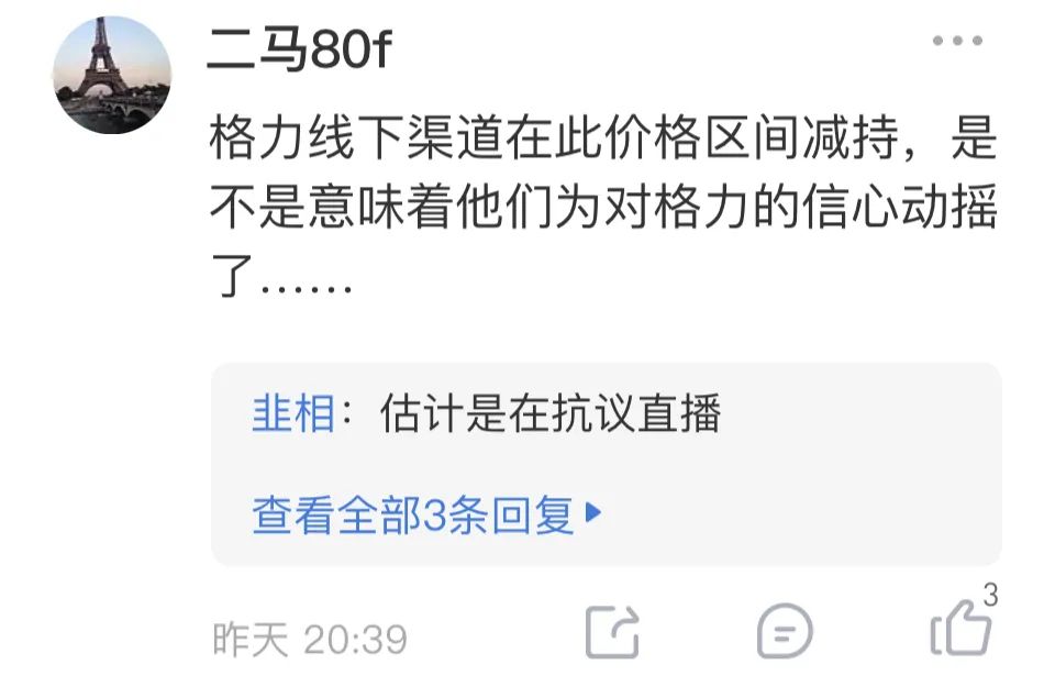 有球友提问,格力线下渠道在此价格区间减持,是不是意味着他们对格力的信心动摇了?有人回复道:可能是在抗议直播。