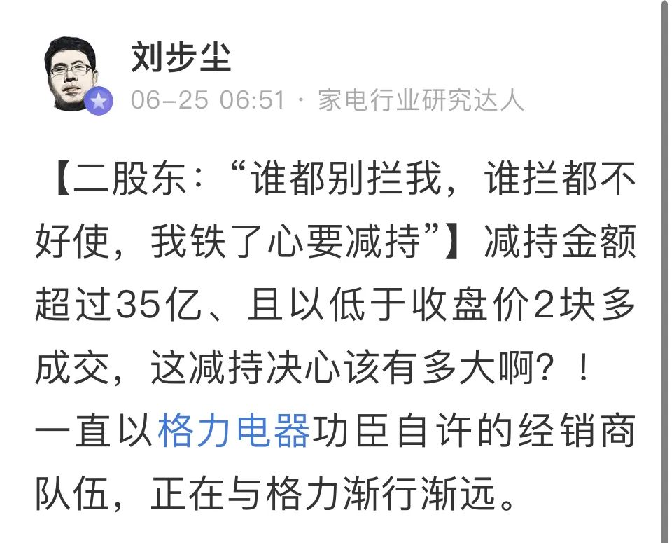 “经销商也跑路了?”,“苦熬一年都没减持,好不容易到了卖空调的季节,二股东为什么要走?”,“是专门安排的吧,这是渠道改革的一部分”....