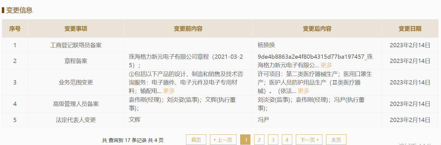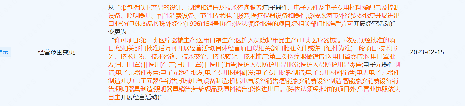 2月16日,珠海格力新元电子有限公司(以下简称“珠海格力新元电子”)经营范围新增第二类医疗器械生产、医用口罩生产、医护人员防护用品生产(Ⅱ类医疗器械)。