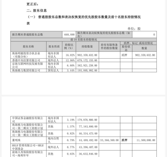 再看格力电器更正后的一季报可以发现,目前除了董明珠的1150万股外,格力电器的第一大股东珠海明骏投资合伙企业(有限合伙)所持的9.02亿股也处于质押状态。公告同时显示,珠海明骏投资合伙企业(有限合伙)与董明珠为一致行动人。