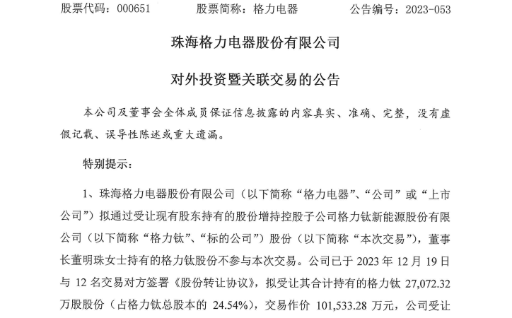 12月19日晚间,格力电器发布公告,公司拟通过受让现有股东持有的股份增持控股子公司格力钛新能源股份有限公司(简称“格力钛”)股份,公司已于12月19日与12名交易对方签署《股份转让协议》,拟受让其合计持有的24.54%格力钛股份,交易作价约10.15亿元。其中,格力电器董事长董明珠持有的格力钛股份不参与本次交易。