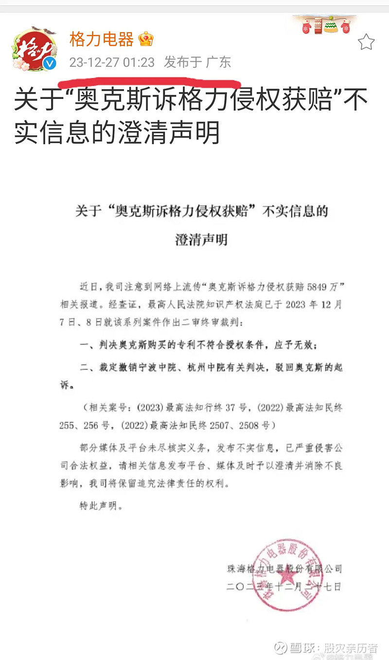 可是当我今早看到格力电器的澄清声明后,我才发现昨晚我说案子还在最高法二审还未宣判是错误的。因为最高法院早在12月7、8日就做出了终审判决,格力电器完胜!