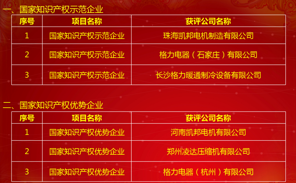 近日,国家知识产权示范/优势企业最新公示结果发布,格力电器共有3家子公司获评为国家知识产权示范企业,3家子公司获评为国家知识产权优势企业。自2013年开始,格力已连续9次进行申报,截至本次公示结果,格力电器旗下已有7家公司入选国家知识产权示范企业,17家公司入选国家知识产权优势企业。