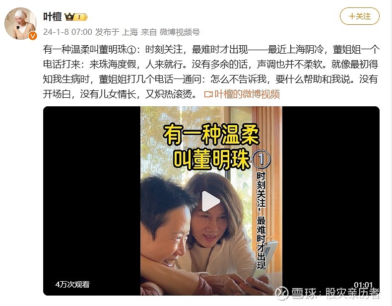 今天一早刷微博就刷到董明珠的好友叶檀发了一组微博,叙述元旦期间受董明珠之邀去到珠海休假的事情,让公众通过公开媒体看到了一个也食人间烟火的董明珠的另一面。