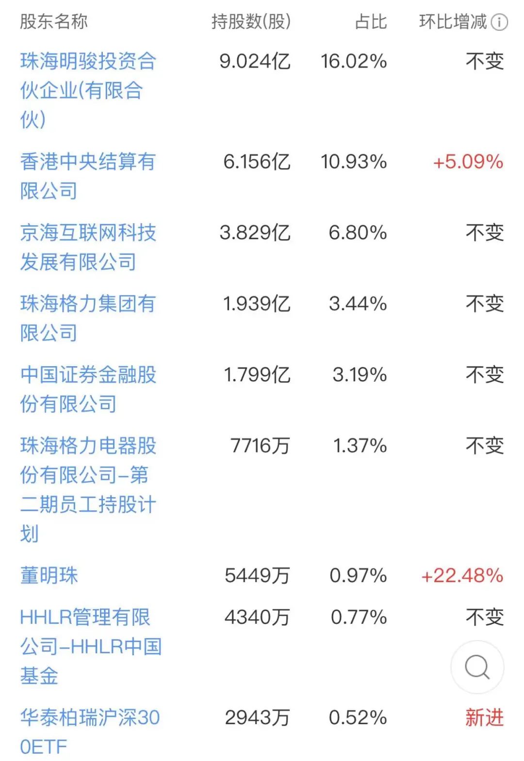 红星资本局注意到,珠海明骏进入格力电器后,一直持股至今。截至2023年三季度末,珠海明骏持有格力电器股权比例为16.02%,为第一大股东;格力集团持有格力电器股权比例为3.44%,是第四大股东。董明珠个人持有格力电器5448.8万股,占比0.97%,是第七大股东。珠海明骏与董明珠为一致行动人。而董明珠曾经的“亲密战友”京海公司(后更名为京海互联网科技发展有限公司)在2020、2022年先后减持格力电器股份后,持有3.829亿股,为第三大股东。