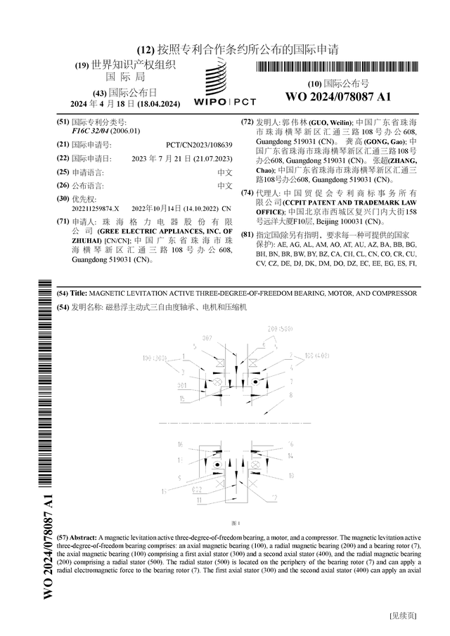 数据显示格力电器(000651)公布了一项国际专利申请,专利名为“磁悬浮主动式三自由度轴承、电机和压缩机”,专利申请号为PCT/CN2023/108639,国际公布日为2024年4月18日。