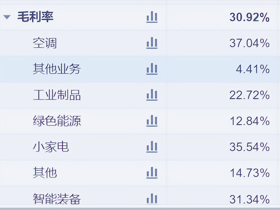 小家电业务毛利率也不错,达到35.5%,就是规模有限;收入规模294亿元的其他业务,毛利率只有4.4%,应该很难盈利。综合毛利率30.57%,增加4.53个百分点。