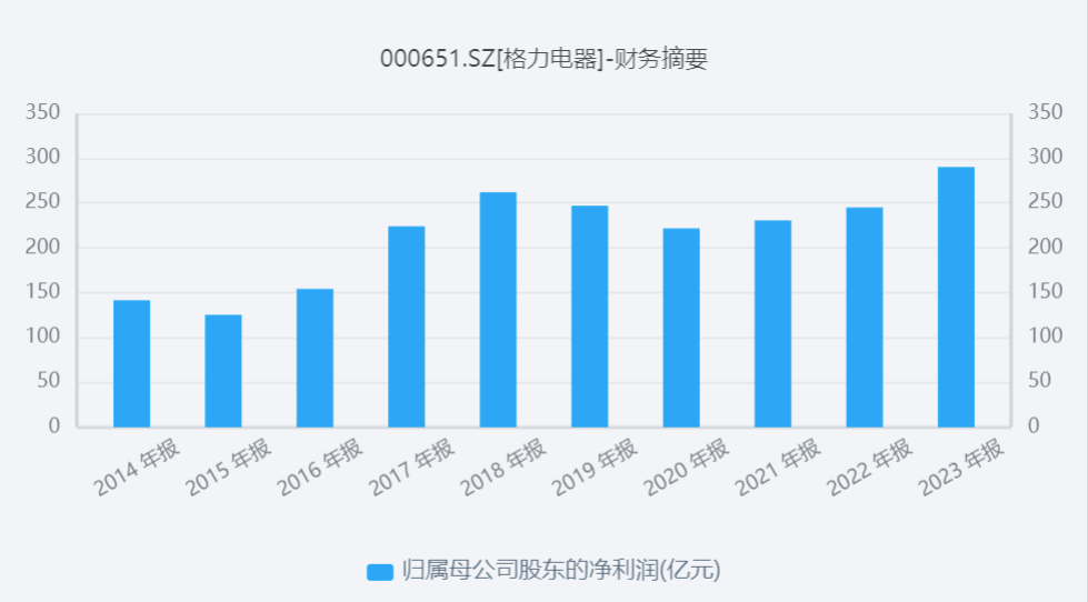 2023年,格力电器实现归母净利润290亿元,增加18.4%,也是2018年后再次回到两位数增幅;基本每股收益5.22元。