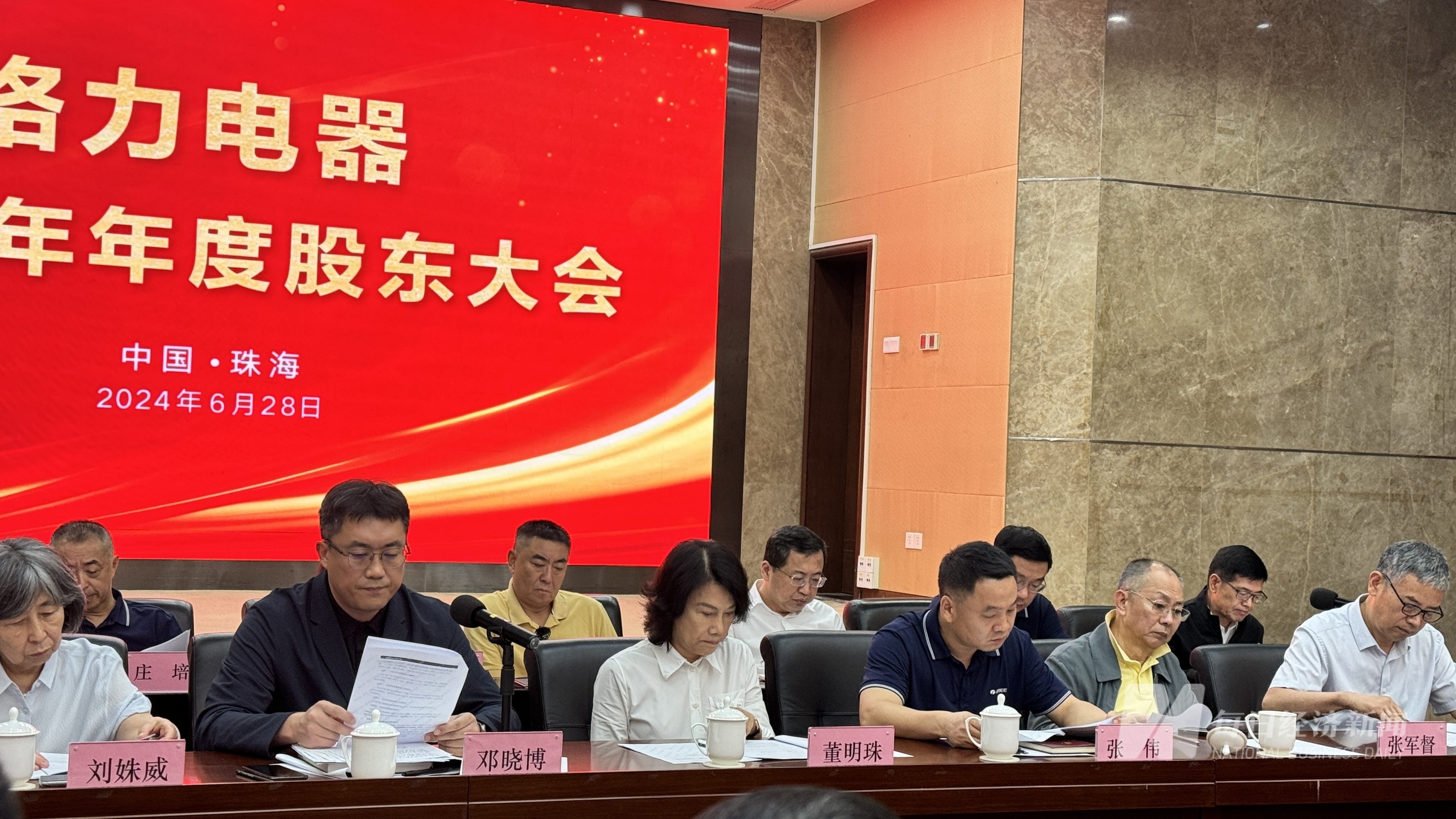 6月28日下午,格力电器(SZ000651,股价39.22元,市值2209亿元)2023年年度股东大会如期在格力电器珠海总部举行。《每日经济新闻》记者现场参会获悉,格力电器董事长兼总裁董明珠、格力电器独立董事刘姝威、格力电器董秘邓晓博,以及此前备受外界关注的格力电器家用电器经营部销售总监卢陆群在内的公司高管悉数出席了会议。
