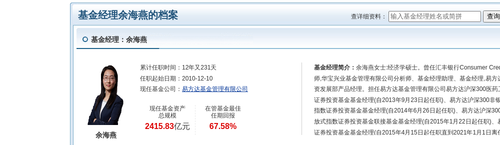 简历显示,余海燕女士:经济学硕士。曾任汇丰银行Consumer Credit Risk信用风险分析师,华宝兴业基金管理有限公司分析师、基金经理助理、基金经理,易方达基金管理有限公司投资发展部产品经理。担任易方达基金管理有限公司易方达沪深300医药卫生交易型开放式指数证券投资基金基金经理(自2013年9月23日起任职)、易方达沪深300非银行金融交易型开放式指数证券投资基金基金经理(自2014年6月26日起任职)、易方达沪深300非银行金融交易型开放式指数证券投资基金联接基金基金经理(自2015年1月22日起任职)、易方达上证50指数分级证券投资基金基金经理(自2015年4月15日起任职直到2021年1月1日离任)、易方达国企改革指数分级证券投资基金基金经理(自2015年6月15日至2021年1月1日任职)、易方达军工指数分级证券投资基金基金经理(自2015年7月8日至2021年1月1日任职)、易方达证券公司指数分级证券投资基金基金经理(自2015年7月8日起任职直到20211年1月1日离任)、易方达沪深300交易型开放式指数发起式证券投资基金基金经理(自2016年4月16日起任职)、易方达中证500交易型开放式指数证券投资基金基金经理(自2016年4月16日起任职)、易方达沪深300交易型开放式指数发起式证券投资基金联接基金基金经理(自2016年4月16日起任职)、易方达中证海外中国互联网50交易型开放式指数证券投资基金基金经理(自2017年1月4日起任职)、易方达中证军工交易型开放式指数证券投资基金基金经理(自2017年7月14日至2021年4月15日)、易方达中证全指证券公司交易型开放式指数证券投资基金基金经理(自2017年7月27日至2021年4月15日)、易方达沪深300医药卫生交易型开放式指数证券投资基金联接基金基金经理(自2017年11月22日起任职)、易方达黄金交易型开放式证券投资基金联接基金基金经理(自2018年8月11日至2021年4月15日)、易方达恒生中国企业交易型开放式指数证券投资基金联接基金基金经理(自2018年8月11日起任职)、易方达黄金交易型开放式证券投资基金基金经理(自2018年8月11日至2021年4月15日)、易方达恒生中国企业交易型开放式指数证券投资基金基金经理(自2018年8月11日起任职)、易方达中证海外中国互联网50交易型开放式指数证券投资基金联接基金基金经理(自2019年1月18日起任职)、易方达中证500交易型开放式指数证券投资基金发起式联接基金基金经理(自2019年3月20日起任职),易方达日兴资管日经225交易型开放式指数证券投资基金(QDII)基金经理(自2019年6月12日起任职)。2022年11月1日起任易方达中证军工交易型开放式指数证券投资基金、易方达中证军工指数证券投资基金(LOF)基金经理。