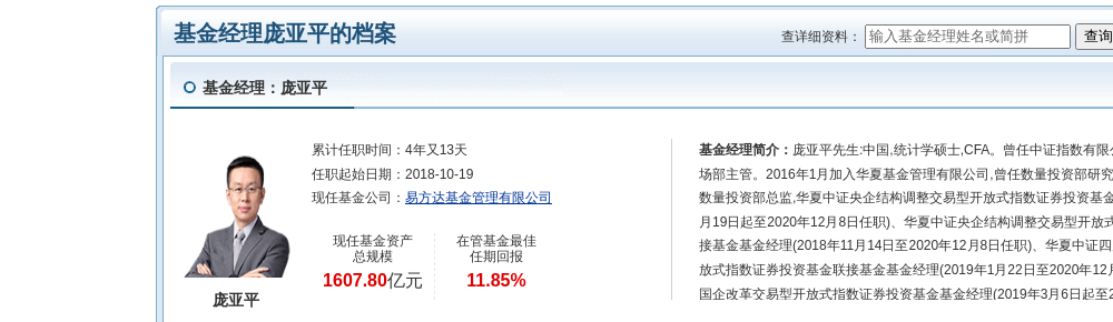 简历显示,庞亚平先生:中国,统计学硕士,CFA。曾任中证指数有限公司研究部研究员、市场部主管。2016年1月加入华夏基金管理有限公司,曾任数量投资部研究员、投资经理等,现任数量投资部总监,华夏中证央企结构调整交易型开放式指数证券投资基金基金经理(2018年10月19日起至2020年12月8日任职)、华夏中证央企结构调整交易型开放式指数证券投资基金联接基金基金经理(2018年11月14日至2020年12月8日任职)、华夏中证四川国企改革交易型开放式指数证券投资基金联接基金基金经理(2019年1月22日至2020年12月8日)、华夏中证四川国企改革交易型开放式指数证券投资基金基金经理(2019年3月6日起至2020年12月8日)。2020年3月18日至2020年12月8日任战略新兴成指交易型开放式指数证券投资基金发起式联接基金基金经理。2020年3月18日至2020年12月8日担任战略新兴成指交易型开放式指数证券投资基金基金经理。曾任华夏中证AH经济蓝筹股票指数发起式证券投资基金基金经理。曾任华夏中证浙江国资创新发展交易型开放式指数证券投资基金基金经理。2022年8月10日担任易方达中证上海环交所碳中和交易型开放式指数证券投资基金基金经理。2022年12月15日起担任易方达沪深300交易型开放式指数发起式证券投资基金基金经理。2022年12月15日任易方达沪深300交易型开放式指数发起式证券投资基金联接基金的基金经理。2022年12月17日任易方达中证500交易型开放式指数证券投资基金发起式联接基金基金经理、易方达中证500交易型开放式指数证券投资基金基金经理。2023年2月10日起任易方达标普生物科技指数证券投资基金(LOF)基金经理。2023年2月15日担任易方达中证1000交易型开放式指数证券投资基金联接基金基金经理。现任易方达中证1000交易型开放式指数证券投资基金基金经理。2023年4月11日至2024年5月7日任易方达中证光伏产业指数发起式证券投资基金基金经理。2023年7月27日起担任易方达中证港股通互联网交易型开放式指数证券投资基金基金经理。2023年8月23日起任易方达上证科创板成长交易型开放式指数证券投资基金基金经理。现任易方达中证家电龙头指数发起式、易方达中证港股通互联网ETF联接发起式、易方达上证科创板100ETF基金经理。