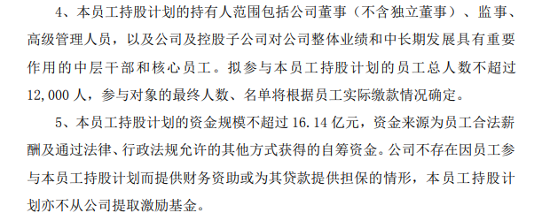员工持股计划的持有人范围包括公司董监高人员(不含独立董事),以及公司及控股子公司对公司整体业绩和中长期发展具有重要作用的中层干部和核心员工,总数不超过1.2万人。其中,公司董事长、总裁董明珠,党委书记、董事张伟,董事、副总裁、董事会秘书邓晓博等7名董监高人士合计认购比例上限为30%。