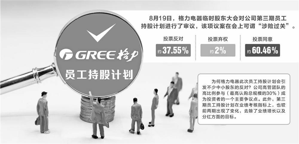8月19日,格力电器(000651)举行2024年第一次临时股东大会,会上对公司第三期员工持股计划进行了审议。该项议案虽然在会上获得通过,但反对票的数量超乎预期,约37.55%的股东投票反对,约2%的股东投票弃权,同意票数的占比仅为60.46%,略高于过半数的通过线,可谓“涉险过关”。