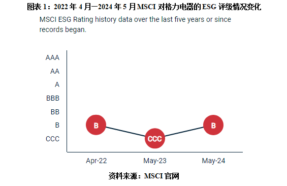 据MSCI官网,如图表1所示,该机构自2022年4月开始对格力电器进行ESG评级,首次评级为B级,并在2023年5月将其ESG评级下调一级至CCC级,在2024年5月再次上调至B级。