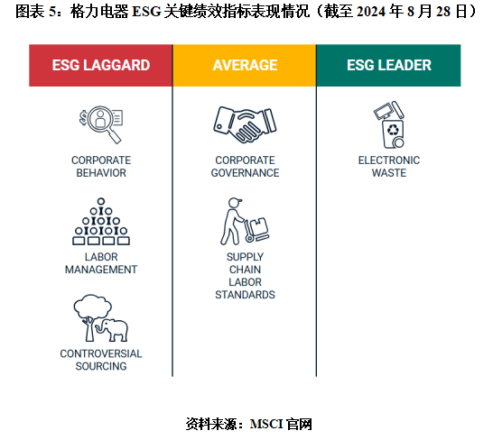 MSCI官网显示,该机构认为格力电器在社会(S)维度的劳务管理、有争议的采购与公司治理(G)维度的企业行为等关键绩效指标的表现落后于同行。