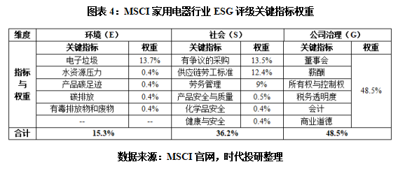 从影响ESG评级的因素来看,据MSCI官网,如图表4所示,在格力电器所属家用电器行业的ESG评级框架中,环境(E)、社会(S)、公司治理(G)三项维度的权重分别为15.3%、36.2%、48.5%。