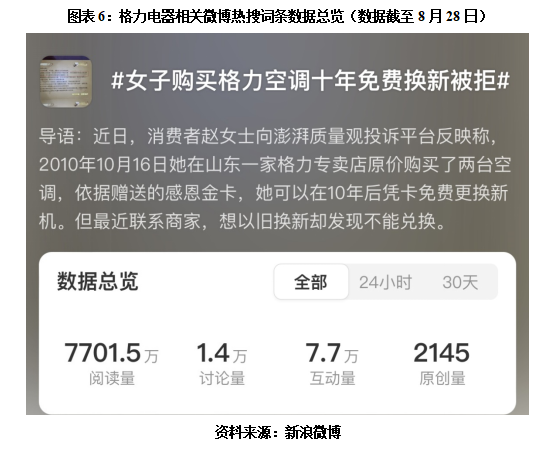此外,今年7月,“女子购买格力空调十年换新被拒”登上微博热搜,截至8月28日该词条阅读量超过7700万,引起广泛关注。