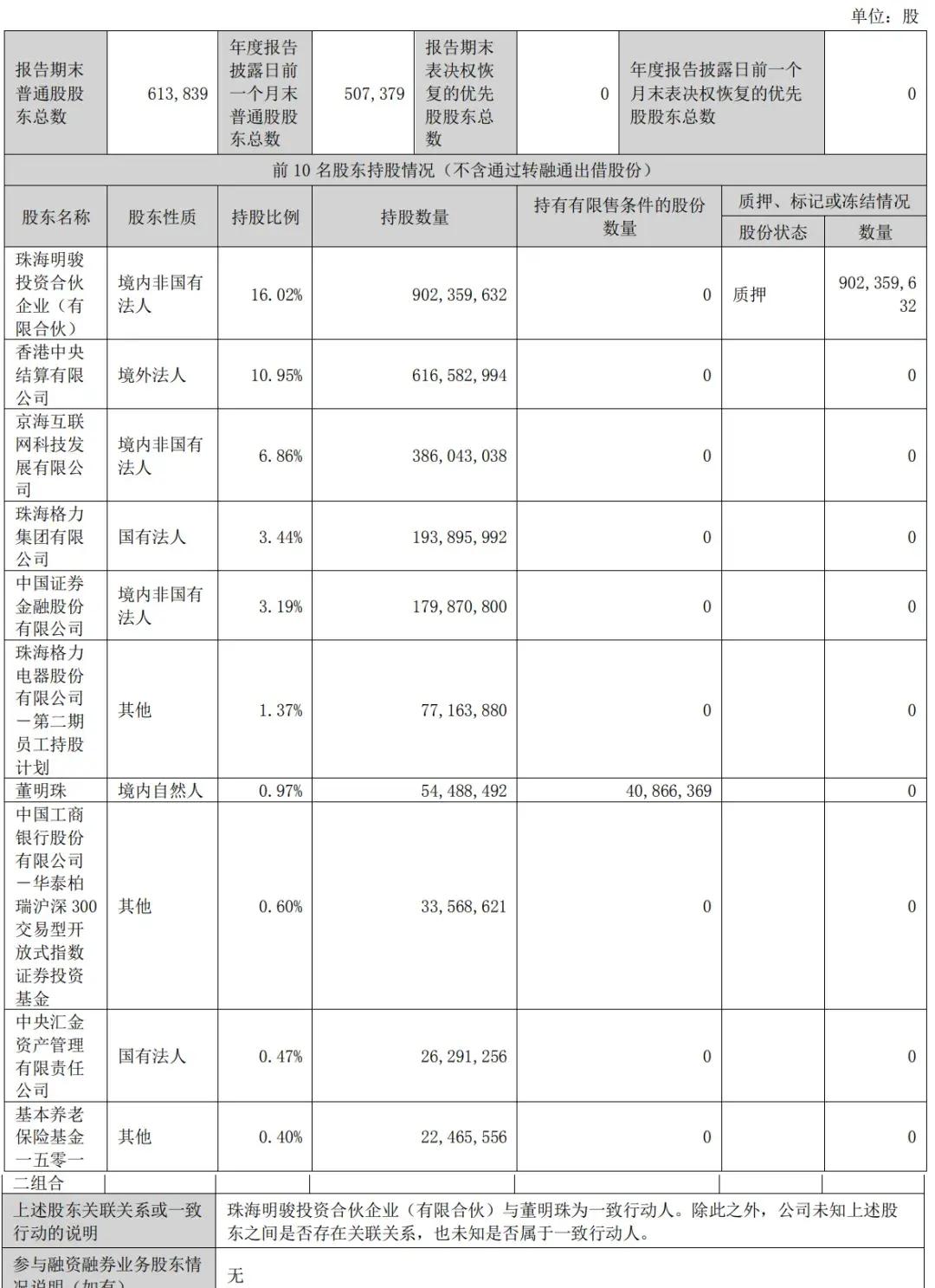 截至2023年12月31日,高瓴旗下珠海明骏投资合伙企业(有限合伙)持股为16.02%,香港中央结算有限公司持股为10.95%,京海互联网科技发展有限公司持股为6.86%,珠海格力集团有限公司持股为3.44%,中国证券金融股份有限公司持股为3.19%;
