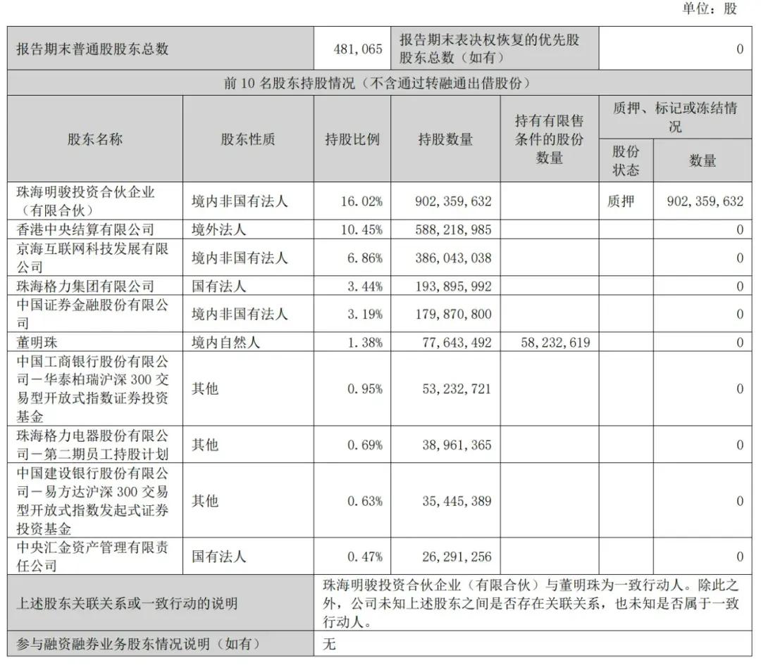 截至2024年6月30日,高瓴旗下珠海明骏投资合伙企业(有限合伙)持股为16.02%,香港中央结算有限公司持股为10.45%,京海互联网科技发展有限公司持股为6.86%,珠海格力集团有限公司持股为3.44%,中国证券金融股份有限公司持股为3.19%;