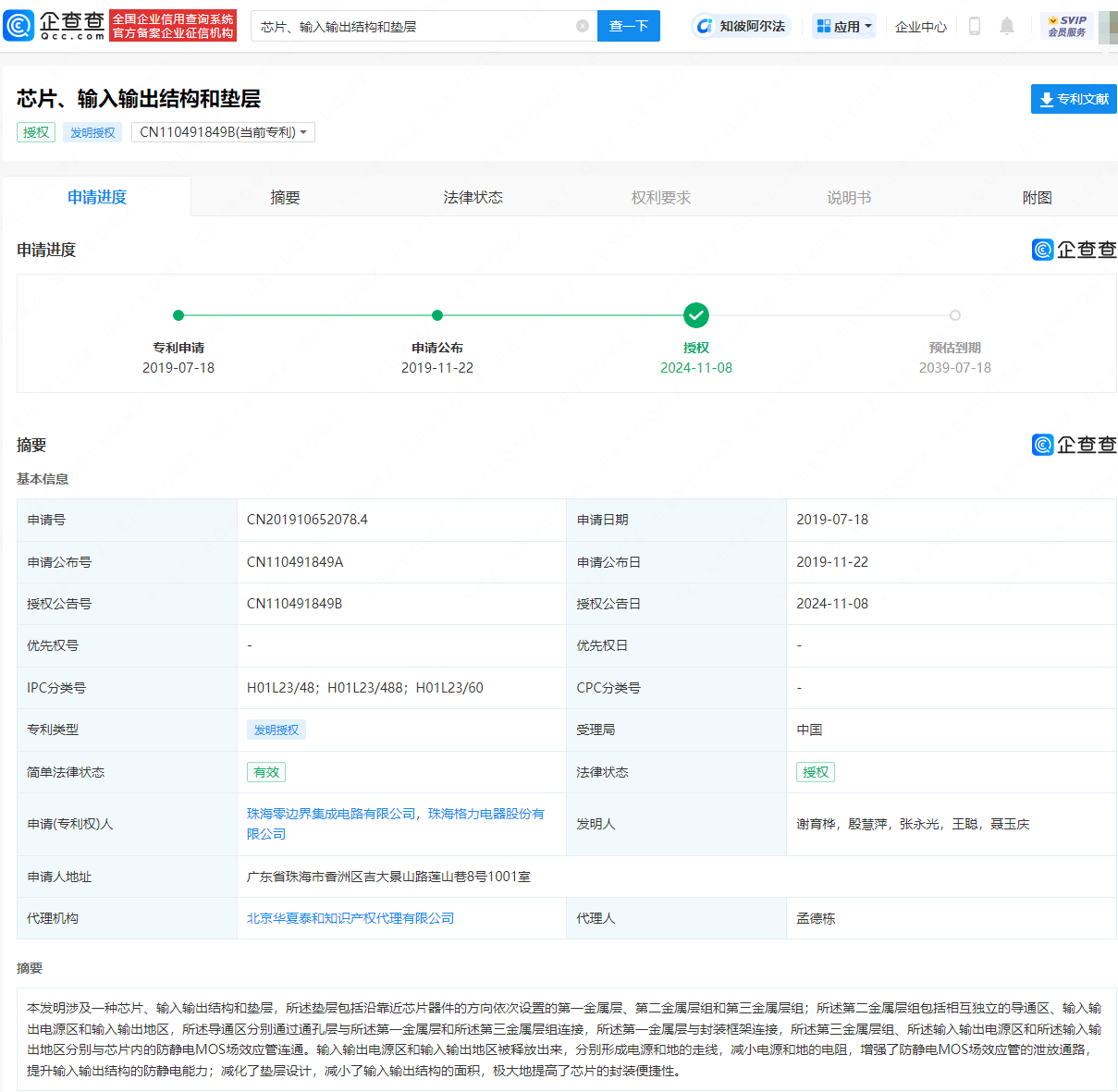 近日,格力电器(000651)、珠海零边界集成电路有限公司申请的“芯片、输入输出结构和垫层”专利获得授权。