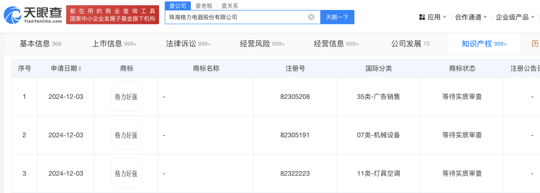 另外,知识产权信息显示,近日,珠海格力电器股份有限公司申请注册多枚“格力好强”的商标,国际分类涉及广告销售、机械设备、灯具空调,当前商标状态均为等待实质审查。