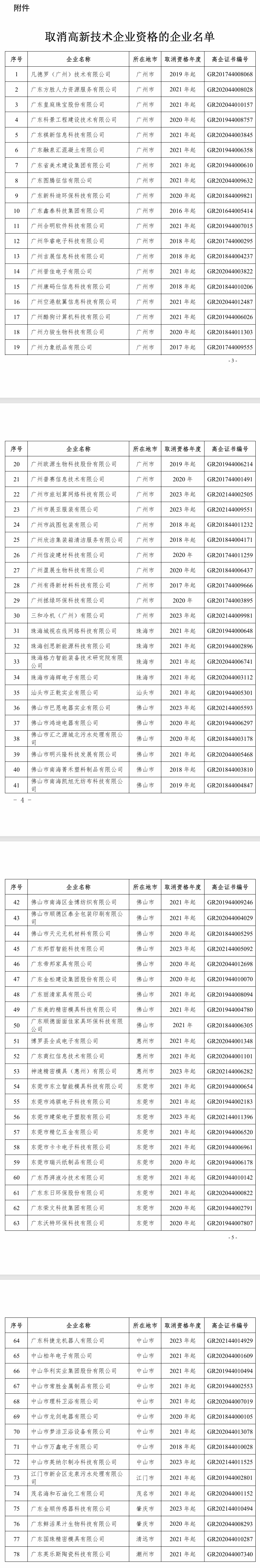 据广东省科学技术厅官网 2024 年 12 月 19 日消息,根据日常管理发现的问题,广东省高新技术企业认定管理工作领导小组办公室按照《高新技术企业认定管理办法》(国科发火〔2016〕32 号)等有关文件规定,经地市核查、专家复核、取消告知等程序,研究决定取消凡德罗(广州)技术有限公司等 78 家企业高新技术企业资格。