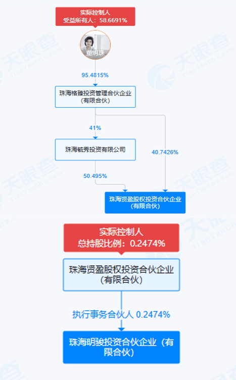 根据股权穿透显示,当前,珠海明骏的实控人为珠海贤盈,而珠海贤盈的实控人或为董明珠。