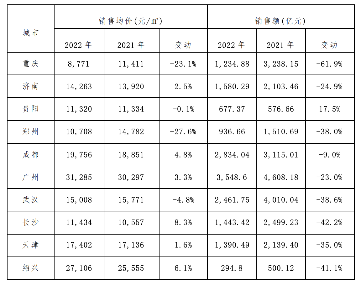 根据金科股份所述,2022年末公司存货主要集中在重庆、济南、贵阳、郑州、成都、长沙、广州、武汉、天津、绍兴等城市,销售情况如下: