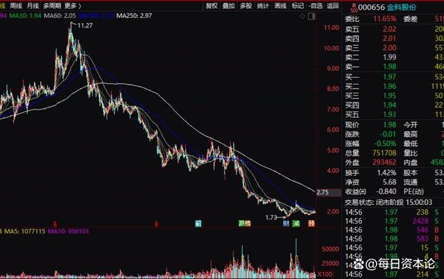 广大投资者似乎更早地用脚做出了投票。金科股份的股价自2020年8月24日摸高11.27元后,便一蹶不振,持续下跌。至2022年10月31日股价已经探底至1.73元。截至2月13日,金科股份收盘价1.98元。