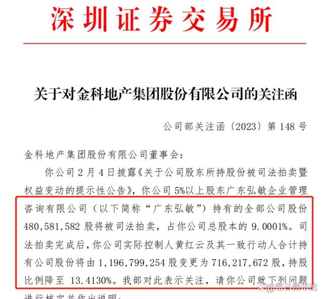 2月10日,深交所向金科地产集团股份有限公司(下称,金科股份)下发关注函。2月4日,金科股份披露由于五矿信托与广东弘敏企业管理咨询有限公司(下称,广东弘敏)之间的金融诉讼案件,法院将对广东弘敏所持有的金科股份4.81亿股进行处置,并拟定于3月8日、9日分三笔在京东网进行法拍。