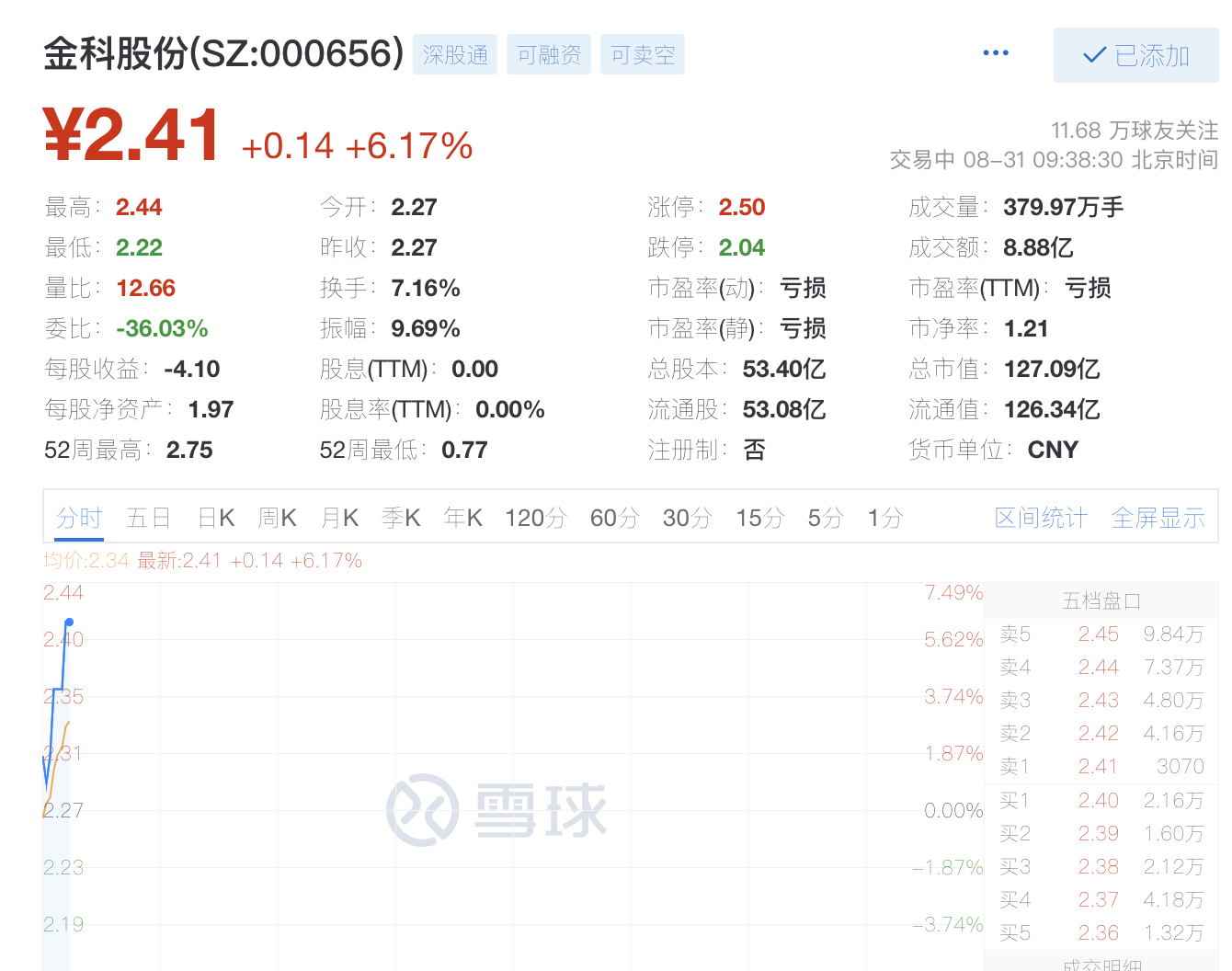 8月31日,金科股份(000656.SZ)早盘快讯拉升,截至发稿(9:38),报2.41元,涨幅6.17%,成交额8.88亿元,最新市值127.09亿元。