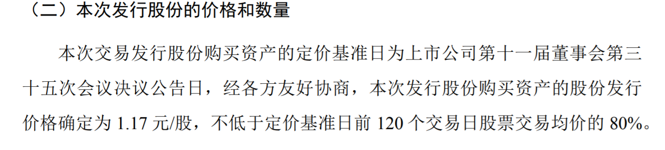 同日,公司发布发行股份购买资产暨关联交易事项的进展公告。数据显示,公司拟以1.17元/股向大股东关联方发行股份用于购买恒昇大业20%的股权,拟定的发行价格约为今日收盘价的6折。