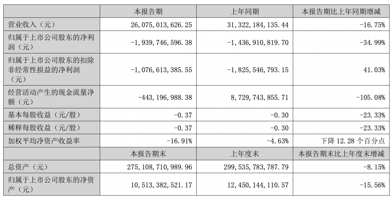 2023年上半年,金科股份营业收入260.75亿元,同比下降约17%;净利润为-13.64亿元,归属于上市公司股东的净利润为-19.40亿元。