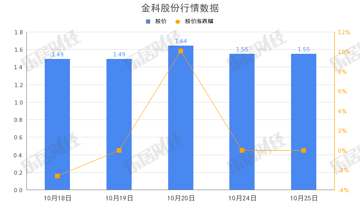 截至10月25日,金科股份(000656.SZ)股价收盘1.55元,成交总额7.25亿元,总市值82.77亿元。