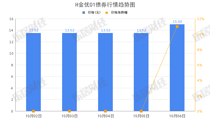 10月26日,“H金优01”(137431)下午盘拉低,截至16:10,跌幅53.33%,报7.00元。总成交量200.00手,成交额1.40万元。