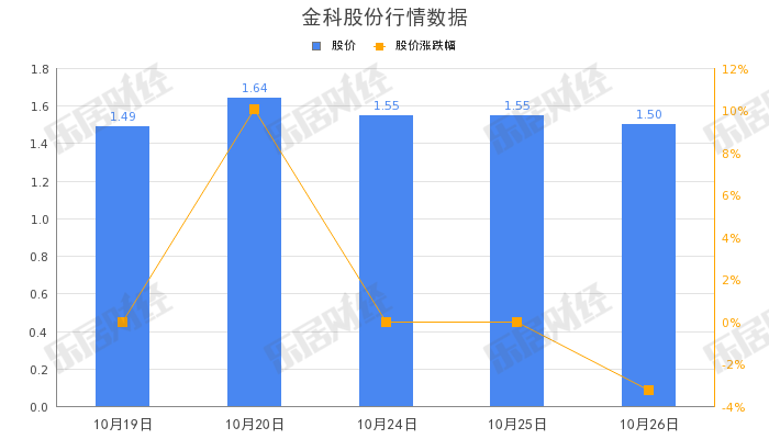 截至10月26日,金科股份(000656.SZ)股价收盘报1.55元,跌3.23%,总市值80.10亿元。