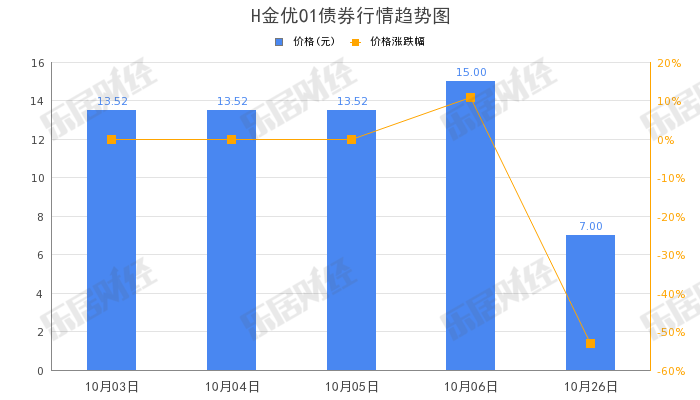 乐居财经 10月27日,“H金优01”(137431)下午盘拉高,截至16:10,涨幅114.29%,报15.00元。总成交量1000.00手,成交额15.00万元。