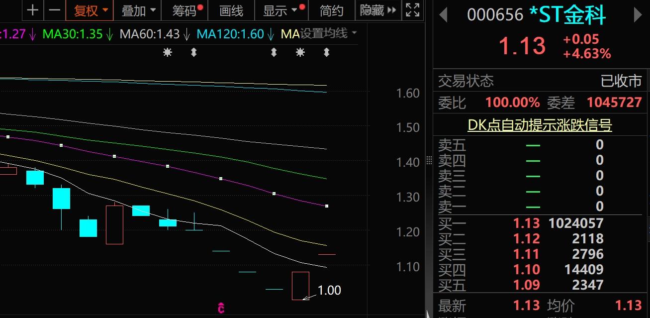 随后,4月29日、4月30日,金科股份迎来连续两日涨停。截止4月30日收盘,金科股份股价已经重回1块大关,报收1.13元/股。