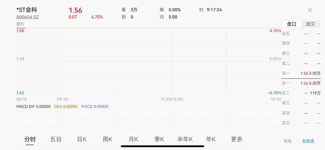 中新经纬5月12日电 12日早盘,*ST金科竞价涨停报1.56元。