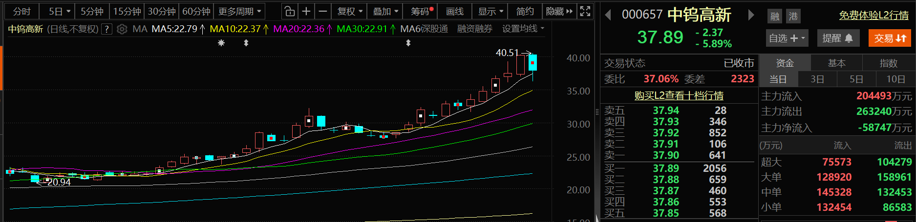 1月20日,中钨高新股价告别五连阳,出现下跌,截至10日收盘,中钨高新跌5.89%,报37.89元/股。