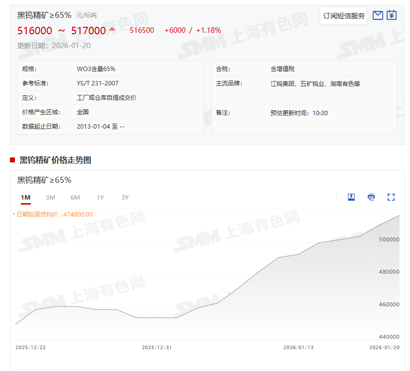 而进入2026年以来,钨价延续了2025年以来的上涨态势,近来更是迭创历史新高!据SMM报价显示,1月20日,黑钨精矿(≥65%)价格为516000~517000元/标吨,均价报516500元/标吨,较其前一交易日上涨1.18%!而516500元/标吨这一均价新高与2025年12月31日的均价453500元/标吨相比,其均价今年以来上涨了63000元/标吨,今年以来的涨幅为13.89%。