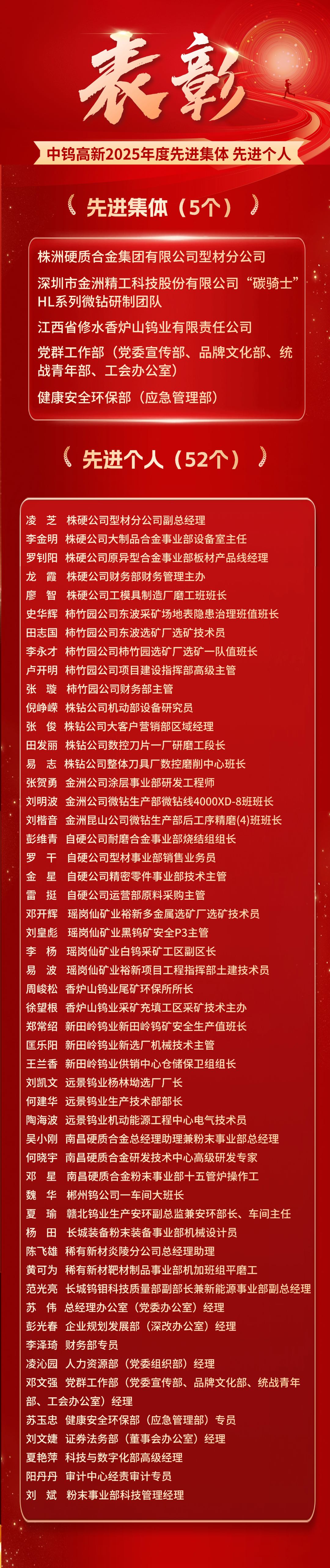 为表彰先进、树立典型,进一步发挥先进典型的示范引领作用,为公司高质量发展汇聚强大力量,公司决定授予株洲硬质合金集团有限公司型材分公司等5个集体公司2025年度“先进集体”称号;授予史华辉等52名同志公司2025年度“先进个人”称号。
