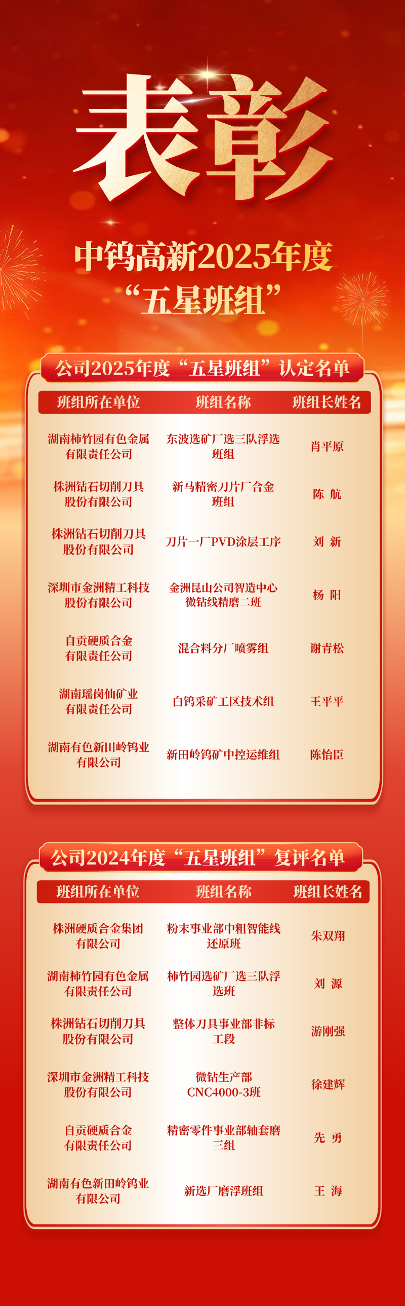 为表彰先进、发挥典型引领作用,进一步弘扬劳模精神、劳动精神、工匠精神,助力公司高质量发展,经各直管企业推荐,公司决定认定“柿竹园公司东波选矿厂选三队浮选班组”等7个班组2025年度“五星班组”称号,通过“株硬公司粉末事业部中粗智能线还原班”等2024年度6个五星班组复评。