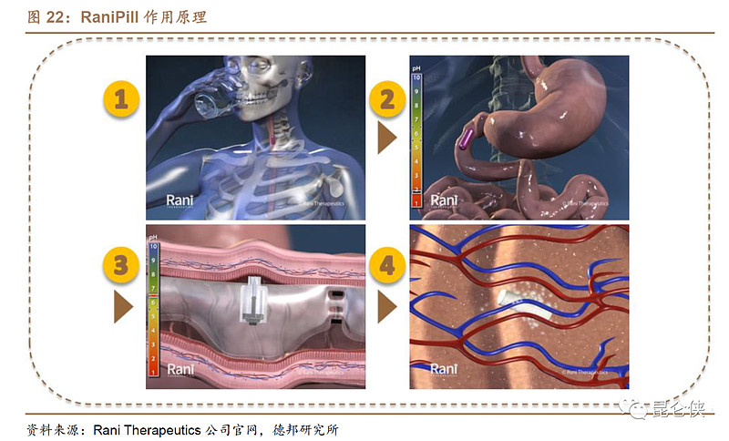 同时在给药方式上,国外Rani Therapeutics 的在研产品RaniPill通过巧妙设计,将“微型注射器”包被在胶囊中,通过口服进入胃肠道组织,胶囊溶解后微型注射器即可将药物注射入血液中。